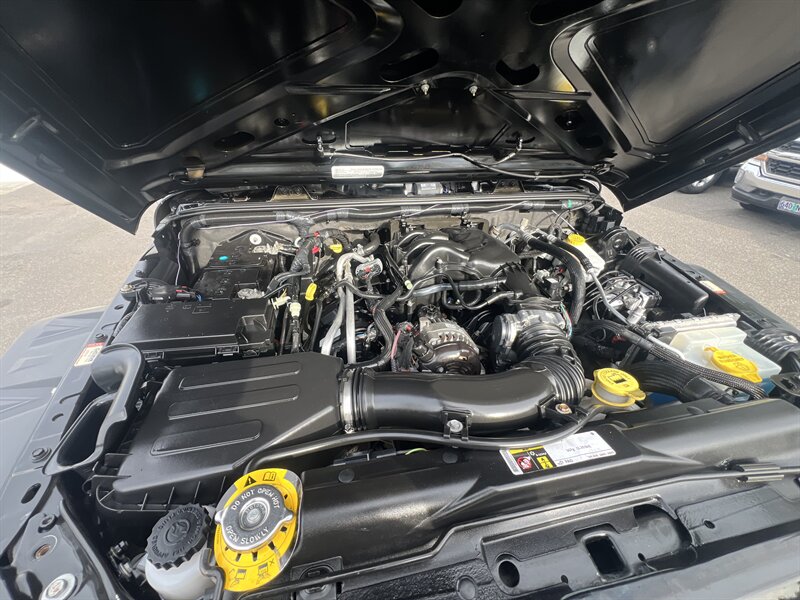 Factory-installed highlights: the 3.6L V6 delivers 285 hp and 260 lb-ft of torque paired with Jeep’s part-time 4-wheel-drive system and rugged solid axles; 4-wheel disc brakes with ABS, electronic stability control and integrated roll-over protection provide core safety; normal-duty suspension (lifted with a leveling kit on this unit) and a 3.21 rear axle ratio support capability and towing flexibility.