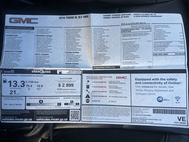Clean CARFAX. Onyx Black 2016 GMC Yukon XL SLT 4WD 6-Speed Automatic Electronic with Overdrive EcoTec3 5.3L V8 Clean CarFAX & Clean Title, Backup Camera, Adaptive Cruise Control, Blind Spot Monitors, Bluetooth, Heated Seats, Keyless Access w/Push Button Start, Navigation, CARFAX BUYBACK GUARANTEE, 4WD.