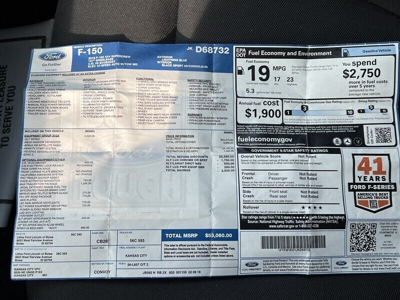 Introducing the 2018 Ford F-150 XLT, a versatile and robust pickup truck that blends capability with comfort. This model is powered by a 3.5L EcoBoost Twin Turbo V6 engine, delivering an impressive 375 horsepower and 470 lb-ft of torque. With this powertrain, the F-150 not only offers robust performance but also efficient fuel economy, achieving 17 MPG in the city and 23 MPG on the highway.